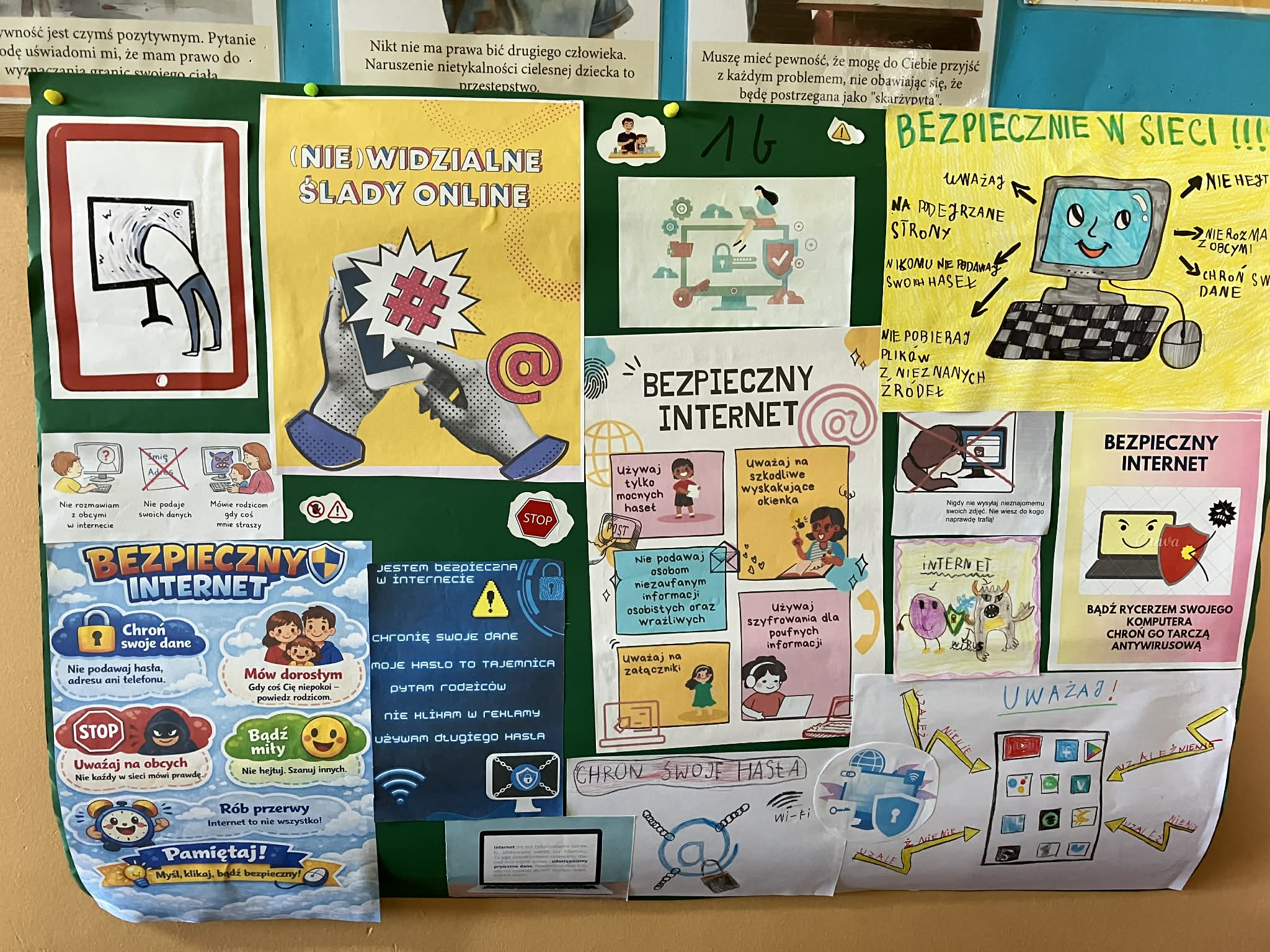 Uczniowie wykonali piękne i pomysłowe plakaty, które przypominają o zasadach bezpieczeństwa online, kulturze w sieci oraz reagowaniu na zagrożenia.